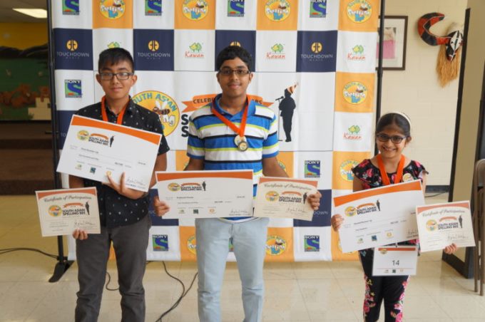 Kyu-Carlo Alegre (1st Runner Up), Sreeniketh Vogoti (Regional Champion), Adrija Rukmini (2nd Runner Up) at the South Asian Spelling Bee Regional in Charlotte, NC.