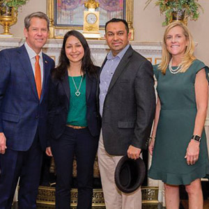 (Left) Brian Kemp, Sheetal Desai, Ritesh Desai, and Marty Kemp at the Georgia Governor’s Mansion.