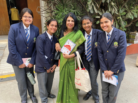 Thursday, January 19: We arrive at the spacious grounds of Clark’s Amer Hotel, where the festival moved last year after outgrowing Diggi Palace, which had been its home since the beginning. I feel a moment of nostalgia for the old palace with its crumbling bougainvillea-covered walls and its raucous peacocks, but then the excitement of the moment takes over. The entrance to the festival is colorfully decorated, and the strains of the just-finished morning music program hangs in the air. Literally thousands of people—many in their twenties or younger—throng the grounds, moving among the five main venues, each of which can accommodate several hundred people. Founders Namita Gokhale and William Dalrymple, along with Sanjoy Roy, the managing director of Teamwork Arts, the company that organizes the festival, inaugurate the program on the Front Lawn stage, welcoming us warmly. Sanjoy informs us that 25 million people worldwide are watching this festival, which is being streamed online. Namita states the festival’s commitment to showcasing Indian languages and translations. Nobel Prize winner Abdulrazak Gurnah gives an eloquent keynote address about writing as an act of resistance. After the program, we meander around the festival, stopping to listen to snippets of discussion about subjects as varied as the Brahma Purana, John Donne, and the extremely popular romantic novels of Durjoy Dutta. People recognize me and ask to take selfies; I feel like a rock star! We have a delicious lunch buffet at the Authors Lounge (courtesy of the Leela Palace, which will also sponsor a Writers Ball on the last night), while guards at the gate keep the paparazzi away. I lounge on cushions, sip fresh coconut water, and admire the tote bag my