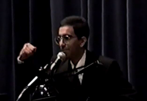 (Right) A teenage Rajiv doing his comedy shtick at an Indian community event in Cincinnati, in 1993.