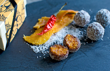 (Right) The mango chili coconut truffle from Shefalee Patel’s Sweet Silk.