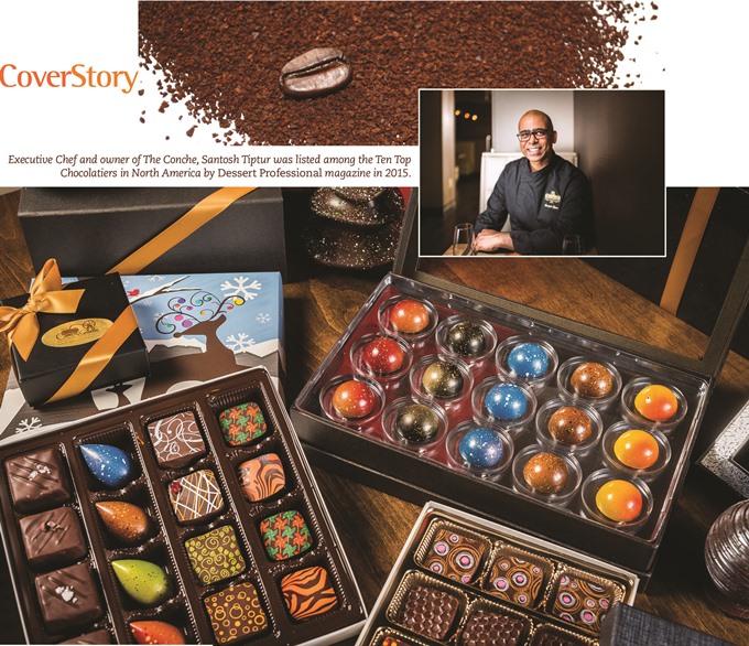 Santosh Tiptur is the man behind the popular new chocolate-themed restaurant The Conche. In 2015, he was listed among the Ten Top Chocolatiers in North America by Dessert Professional magazine. Food, especially chocolate, was always on his radar. He remembers that growing up in India he loved to cook with his mother. “One day my uncle, who owned a bakery, was visiting us. Mom asked him to show her how to bake a cake. We did not have an oven, but that did not stop them. They used heated sand to bake the cake, which I can still see and smell in my mind—that was fascinating!”