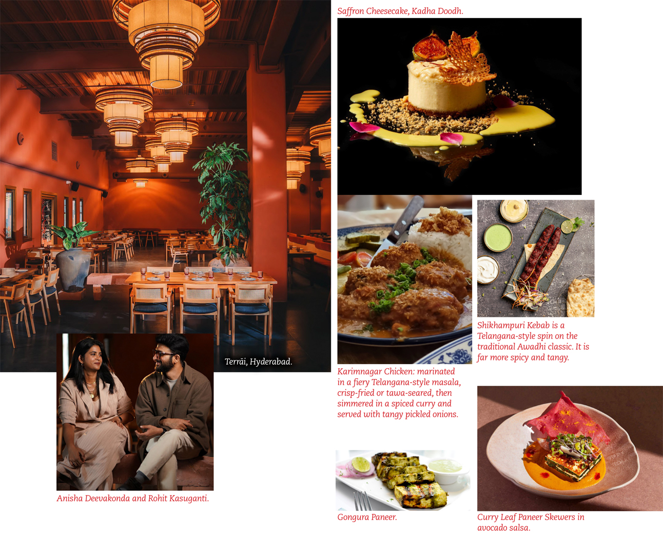 Founded by restaurateurs Rohit Kasuganti and his wife Anisha Deevakonda, Terrāi is the only restaurant in India dedicated exclusively to the cuisine of Telangana—the country’s newest state. “Our core objective,” says Kasuganti, “is to bring the deeply rooted culinary traditions of the state into a sharp spotlight. Every dish served at Terrāi stands as a vibrant tribute to the land, meticulously crafted with local ingredients sourced predominantly from women farmers and tribal chefs who employ time-honored techniques.”