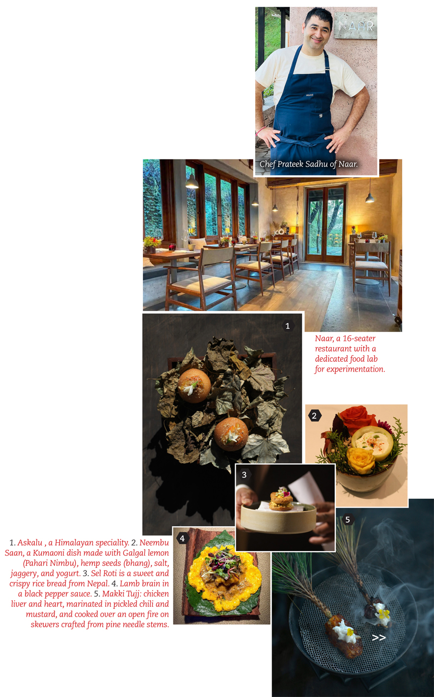 Blending traditional Himalayan ingredients and recipes with contemporary techniques, Sadhu creates dishes that challenge conventional notions of fine dining. He calls the food “micro-regional,” rooted deeply in the diverse culinary landscape of the Himalayan belt. Located two hours from Chandigarh, Naar is an invitation to experience fine dining as an immersive, destination-led experience.