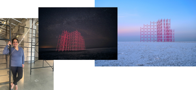 Contemporary artist Avantika Bawa’s “Pink Scaffold,” a sphinx-like art installation that rises above the horizon of the Rann of Kutch.