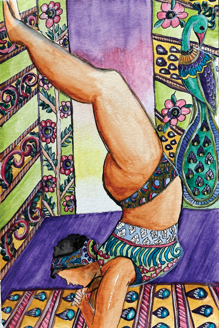 [Left] To challenge the whitewashed notions that box Indian artists into stereotypes, Tibrewala showcased “Curvy Yoga,” a series of work at the Tahoe Art League. “I showed Indian princesses in ethnic wear practicing yoga. I also showed curvy women confident in their plus-size bodies performing asanas,” she says.