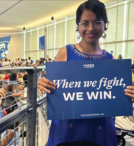 [Right] Speaking about hearing “Kamala” reverberating through the crowd at a rally she attended, Usree Bhattacharya, whose grandmother's name is also Kamala, says, “That moment filled me with so much joy, pride, and a sense of belonging. I think her story is, in so many ways, our story, the story of possibility in America.”