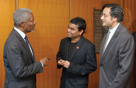 [Left] With Kofi Annan, the UN's former Secretary-General, and music composer A.R. Rahman.(Source: UN Photo Library)