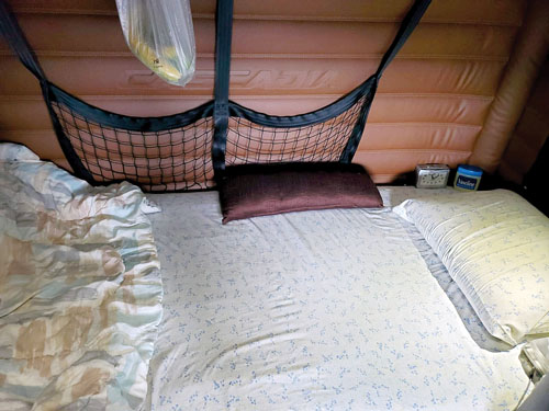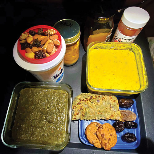 [Left] The health conscious Raja Sekhon packs nutritious home cooked food for his time on the road. A typical meal includes rotis made from spelt flour, daal, saag, and dahi. He also packs several herbal remedies and healthy snacks such as ginger, turmeric, honey, dry nuts, prunes, dates, figs, homemade gluten-free cookies, Metamucil, and plenty of warm water. [Right] Sekhon’s comfortable bed in his truck.