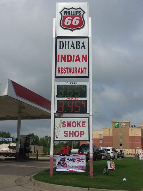 Truck Stop 40, the dhaba in Sayre, Oklahoma is one of the oldest establishments serving desi drivers. Besides the usual offerings of a gas station, convenience store, showers, and lounge; the Truck Stop 40, run by Harpreet Chhoker, also offers a 24-hour eatery and Gurudwara for worship.