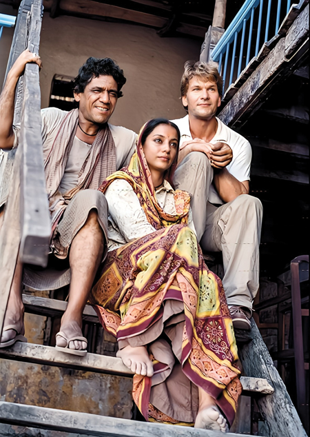 [Right] Om Puri, Azmi, and Patrick Swazye in City of Joy.