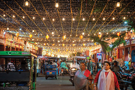 fronds, strings of lights, and lanterns. I couldn't wait to drive through historic landmarks like Sanganeri Gate, Ajmeri Gate, and Chand Pol to witness the beautifully decorated shops that displayed clothes, jewelry, firecrackers, sweets, and fruit. The ancient Purvmukhi Hanuman Temple at Sanganeri Gate, when lit up, was even more special. The wide Mirza Ismail Road became a party promenade with a sea of people walking around, dressed in their Diwali best, while shopping and tasting street food late at night.
