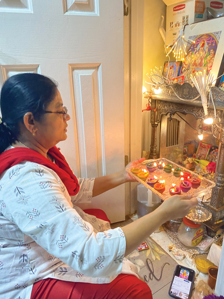 [Left] The author’s mother doing a puja during Deepavali.