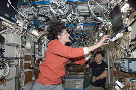 [Top] Using a laptop on the ISS. Japanese astronaut and flight engineer Aki Hoshide is behind Williams. (Photo: NASA)