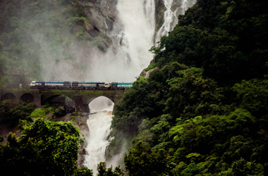 Passing through many Goan villages, the train travels between Karnataka and Goa, revealing the beauty of both states. Stand at the edge of the door to watch the train climb up the steep Braganza pass and follow a horseshoe bend over the valley as it approaches the falls. In the monsoon, the spray from the falls creates a mist, giving an ethereal experience through the valley. After the 3 hour 30 minute journey, the evening glow in Londa created by the late evening sunset punctuates the beauty of the Western Ghats.