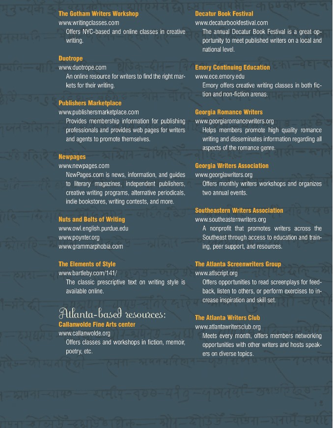 For Soniah, who is three years into a fouryear MFA at Georgia State University, it’s a tough call. “One can go both ways,” she points out. “I wrote my book before I started my MFA. What is really important is to receive feedback and to actively seek it. But the good thing about an MFA program is that you are in a class full of people who can do that [provide feedback]. I signed up for the MFA program because I was curious about it…and also because I won a scholarship!”