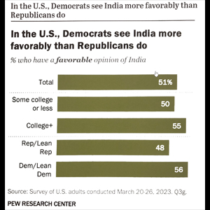 Indians, according to a Pew Research Center survey, have a generally favorable view of America, although 68% of Indian respondents believe that the U.S. interferes in the affairs of other nations. The American view of India is more mixed. While 65% of Indian respondents view the U.S. favorably, only 51% of American respondents say the same about India. Democrats and Democratic-leaning independents, at 56%, are likely to view India more favorably than Republicans and Republican-leaning independents (48%). Indians, with their preference for Democrats, return the favor (64% say they trust Biden to do the right thing). How do Americans view PM Modi? Well, a substantial number (40%) didn’t even know about him. This number has gone down, most likely, given that the survey was done before Modi’s state visit. Among U.S. nationals who know about Modi, according to Pew, “37% have little or no confidence in his ability to do the right thing regarding world affairs, compared with 21% who are confident in him.”