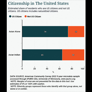 The Asian American electorate has experienced the biggest growth among major groups. So it’s fitting that AAPI Data has launched a tool called the Community AANHPI Explorer. It enables us to access data-driven insights on Asian American, Native Hawaiian, and Pacific Islander communities across the nation. For instance, to display information about local Indian Americans, we can pick the State (Georgia), Race group (Asian alone), and Ethnicity group (Asian Indian). For education, we’ll see that 78% of Indian residents 25 and older have a bachelor’s degree or higher (for Asians overall, it’s 58.4%). Next, if we click on Citizenship and then Apply Changes, we’ll see that, as of 2022, 63.7% of Indian residents here were U.S. citizens (for Asians overall, it was 68.2%). How many Indians in Georgia were born in the U.S.? Only 29.6% (for Asians overall, it’s 29%). The data can be displayed in three ways: Bar chart, map, or line chart.