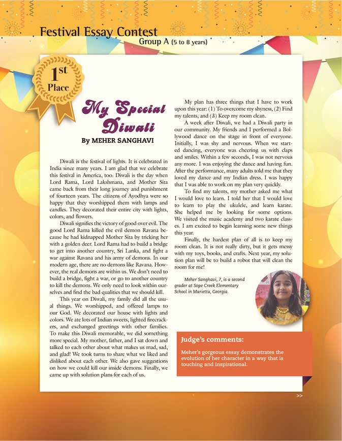 First Place: MEHER SANGHAVI (“My Special Diwali”), Marietta, GA