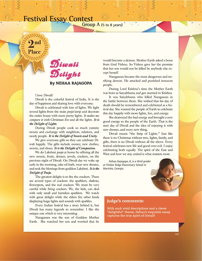 Second Place: NEHAA RAJAGOPA (“I Love Diwali!”), Marietta, GA