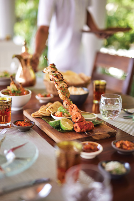 Due to its proximity to Sri Lanka and India, there is a strong influence of flavors, spices, produce, and even cooking techniques from these cultures in the Maldives. Like Arun, many of the sommeliers and chefs are from nearby India and have found great success in the Maldives. As wine and spirit experts, they have broken cultural stereotypes and made a name for themselves. The Indian chefs employed in these resorts are changing the rhetoric of traditional Indian cuisines by infusing ingredients, spices, and techniques that are a beautiful mix of all of Maldives’ cultural influences. Prabhash Prabhakaran is the executive chef of all restaurants at Anantara Kihavah. He hails from Kerala, where he learned traditional Indian cooking techniques and culinary secrets from his grandmother and mother. He began his career with Taj Hotels across India, before relocating to Jumeirah Emirates Towers in Dubai and Chedi Muscat in Oman thereafter. “Working alongside Michelin- starred chefs has inspired me to broaden my horizons to encompass multi-regional cuisines that culminate in a marriage of authentic home cooking and fine global flavors,” he notes.