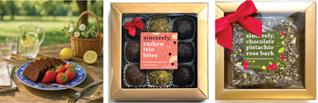Finally, the vegan chocolate pistachio rose bark is a soft, smooth, and guilt-free treat made with singleorigin Peruvian organic dark chocolate and ground cardamom. The texture of grated coconut, chopped pistachios, and edible rose petals tastes more like mithai, than a bar of store-bought chocolate. It also comes in an allergen-friendly gift box that anyone would appreciate regardless of their dietary preference. There are also muffins, cookies, and special occasion cakes made to order.