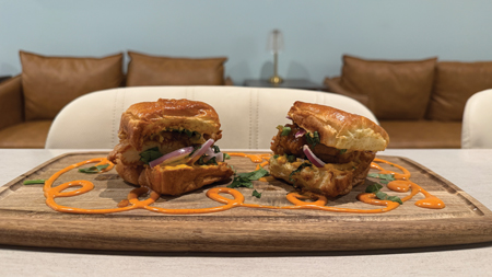 [Right] The Kerala Fried Chicken Sandwich (KFC) blasts sweet and spicy flavors in your mouth.