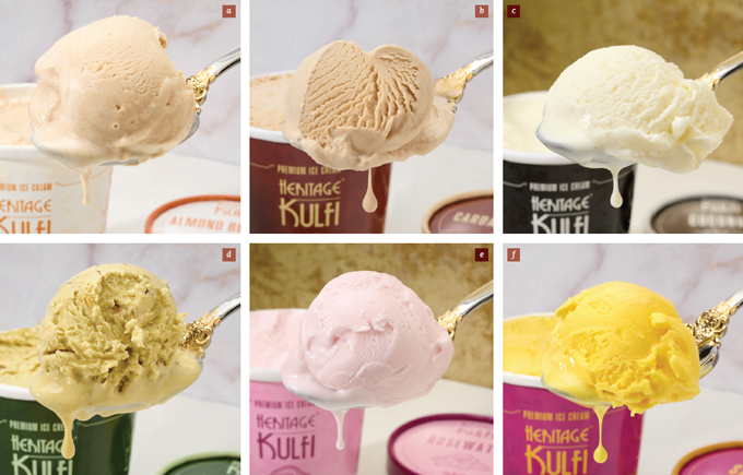 Some of the flavors of Heritage Kulfi: a. Almond Blossom; b. Cardamom Chai; c. Coconut; d. Pistachio: e. Rosewater; f. Saffron