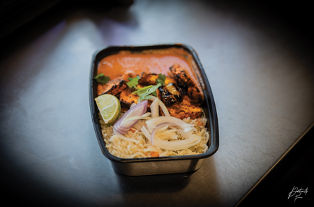 The food was fresh and tasty. Seen here is a rice and paneer bowl (below) and tandoori chicken (left)
