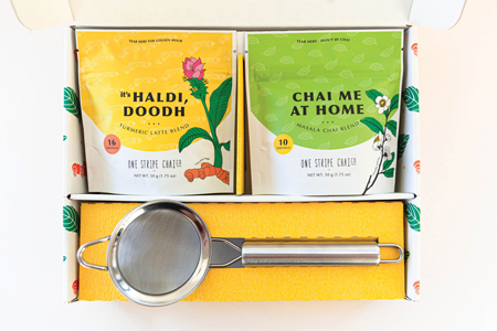 Atlanta-native Farah Jesani founded One Stripe Chai Co. created chai blends and pre-mixed haldi doodh based on her mother’s recipes, sourcing tea leaves from ethnic and biodynamic farms like Chota Tingrai in Assam.