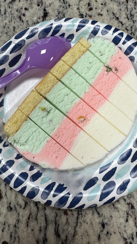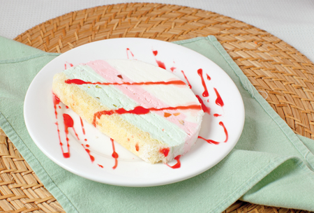 The classic cassata—the famous triple-layered ice cream bar with vanilla, tutti-frutti, pistachio, and a slice of dry sponge cake.