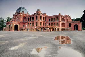 JAGATJIT SINGH PALACE: An inscription on its external façade states that construction of the palace began in 1882 and ended in 1889. It consists of three structures joined together with rooms and doorways. The main structure, built by Maharaja Jagatjit Singh, was once the Durbar Hall. It has a rectangular plan, consisting of a central double-height hall with aisles on both sides and a double-height entrance hall. Today, it is used as a library but there remain the elements of a grand palace.