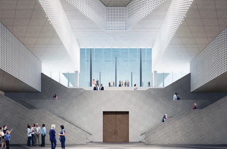 [Right Photos] His Highness Aga Khan IV’s love of architecture is evident in the stunning designs of all seven Ismaili Centers around the world. Seen here are the exterior of the center in Toronto, Canada, and a graphical rendering of the interior of the one in Houston, Texas.
