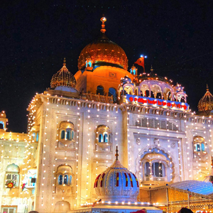 [Left] Gurudwara Bangla Sahib in New Delhi lit up for Gurupurab.