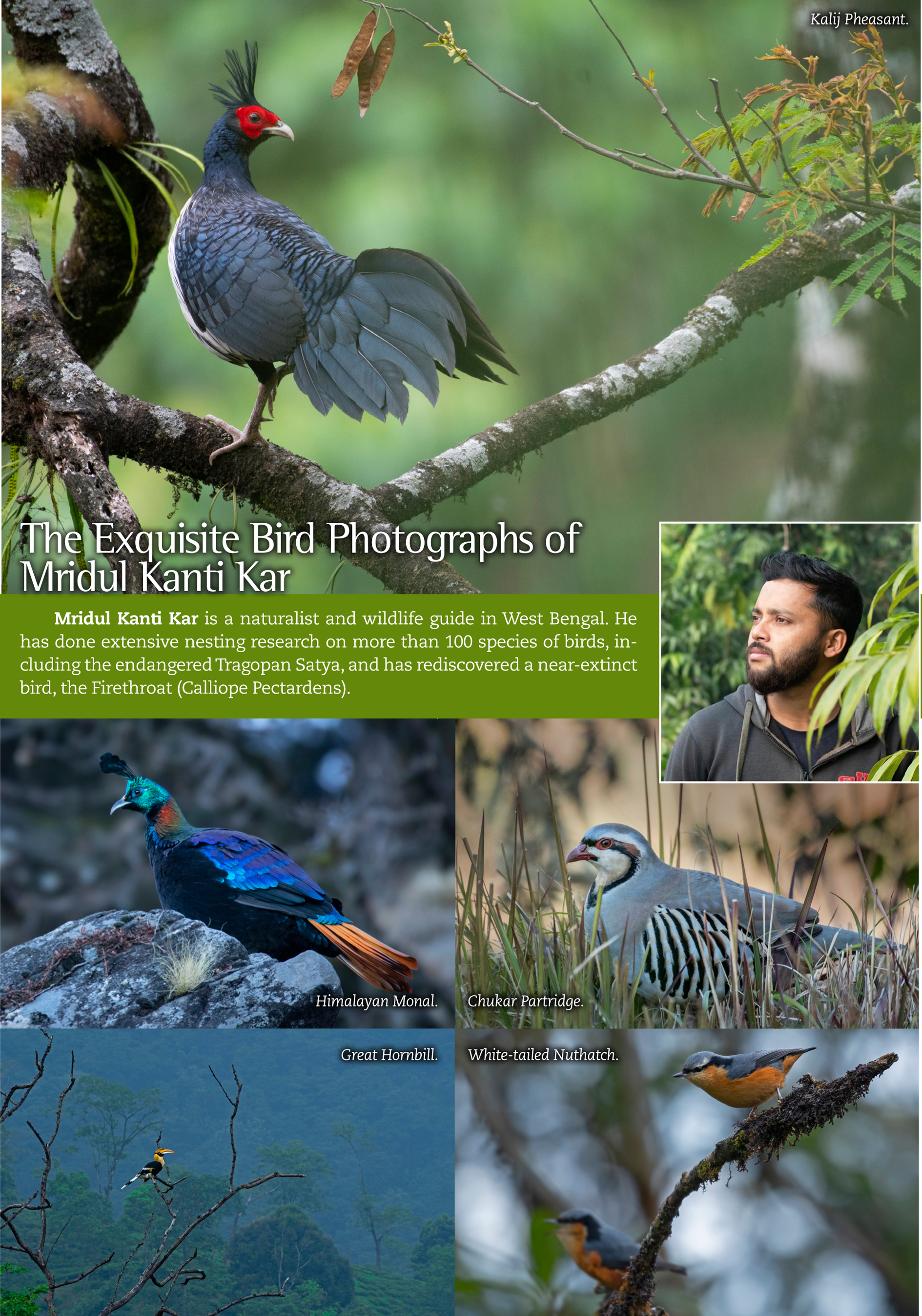 Saswat Mishra’s birding journey also began at home when he started birdwatching while exploring his backyard and surroundings. He got interested in the Scalybreasted Munia, a common bird. This inspired him to research birds and look for more species around him. “In my very first year of doing this, in 2012, the count went up to more than 120 species just in and around my own backyard and surrounding areas,” says Mishra. His favorite kinds of birds are woodpeckers, owls, kingfishers, and smaller birds like warblers. He adds, “My favorite so far is the Forest Owlet, which is an endemic species of India only found in very specific kinds of forests of Western and Central India. I am currently involved in its conservation plan, and I use my photographs to make people aware of such endangered species.”Aditya Roy has been successful in creating a formidable professional career around his lifelong passion for nature and birds. A wildlife biologist working in the field of conservation since 2000, Roy has traveled extensively in Gujarat, Rajasthan, and Madhya Pradesh during his work on critically endangered vultures. Currently, he is pursuing his PhD in toxicology of vultures from Salim Ali Centre for Ornithology and Natural History, Coimbatore. He has worked with Bombay Natural History Society and Wildlife Institute of India for research projects on vultures, flamingos, and Asiatic Wild-Ass. His papers and articles on vultures have been published in national and international journals.