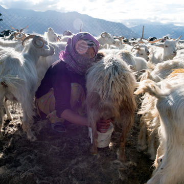 11. (Right) Yangchan collects milk in one of the family’s goat enclosures during the early morning hours before the goats are released and begin lining up to exit the valley and be led by KunSang to graze. All goats are fenced in circular enclosures during the night to protect them from predators such as wild dogs.