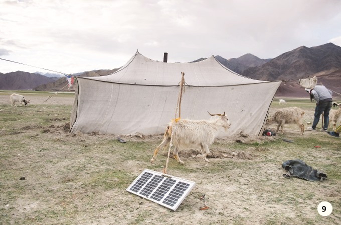 9. (Above) A solar panel is posted outside of KunSang’s tent in the evening hours in a valley near Nyoma. With long summer days, the solar panel charges a battery inside the tent that is connected to a radio and a lamp which serve for much needed news and a night light where KunSang sleeps with his wife Yangchan and their two-year-old son Tenzin.