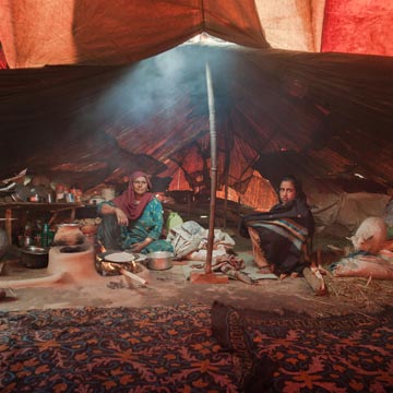 6. (Right) Sariya, 34, Fareed’s wife, and daughter Rahima, age 17, along with the family Pashmina goat, relax in between meal preparations.