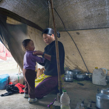 10. (Left) Yangchan Lhamo, 30, buttons up the shirt of her son Tenzin before leaving the tent in the morning to collect milk among some of the 440 Pashmina goats their family owns. The division of labor is clearly divided as the young men do all of the higher altitude daily grazing of the herd and the women, children, and elders care for the animals that are left behind, among other daily work.