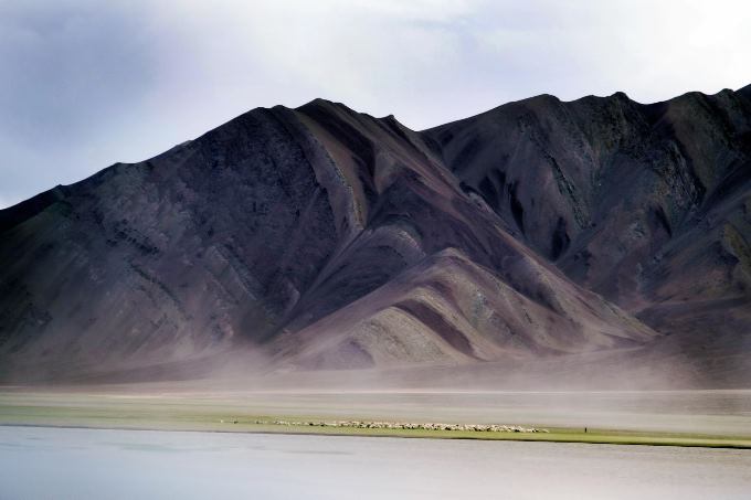 8. (Above) On the southern edge of the Indus river bank, KunSang returns with his herd of goats after a day of grazing in the towering mountains nearby. These banks are home for the summer before KunSang and his family move their settlement to higher elevation in search of grass valleys for the fall period before returning to semipermanent lodging in the village of Nyoma for the harsh winter.