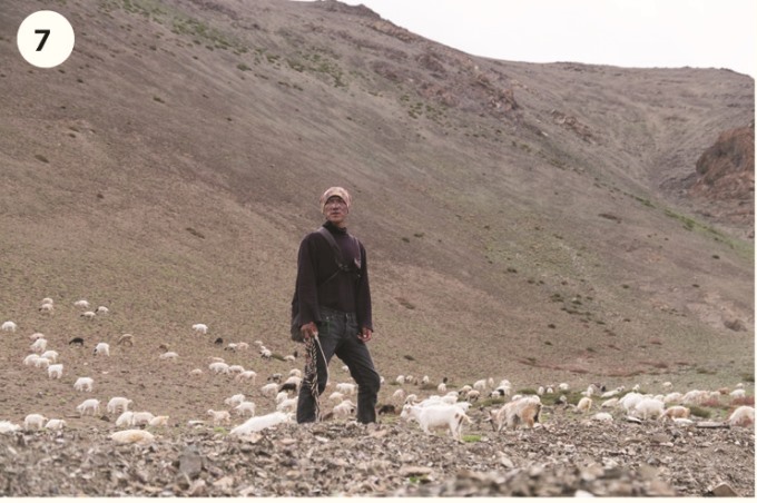 7. (Below) KunSang Namgyal, a 29-year-old of Tibetan descent, belongs to the seminomadic Changpa tribe and lives throughout the year near the Nyoma village that borders western China in the north Indian territory of Ladakh. KunSang grazes his Pashmina goats during the warm summers when the snowmelt has left a healthy grass stock for the animals to feed on.
