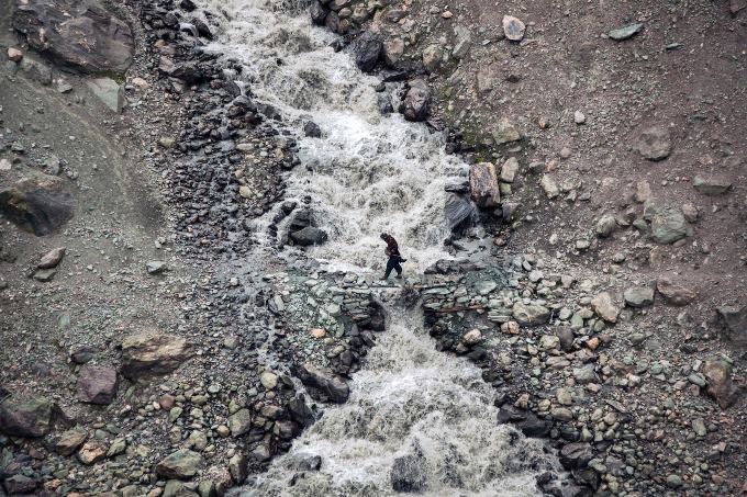 5. (Above) Fareed Ahmed, 41, and Ali’s neighbor, brings a stone to fix the bridge he has built for his family who regularly cross it to graze their goats. Fareed comes from a part of the Bakarwal community that migrates to these higher altitude regions from the northern foothills of Jammu. |