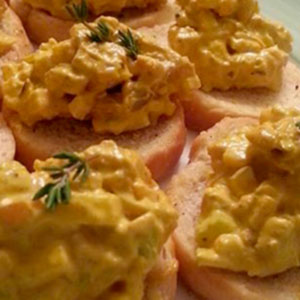 To place a Caribbean twist on your appetizers, here is a fun option. Instead of a regular chicken salad that goes as a topping for your toast points, how about curried chicken instead? It has a punch of color and