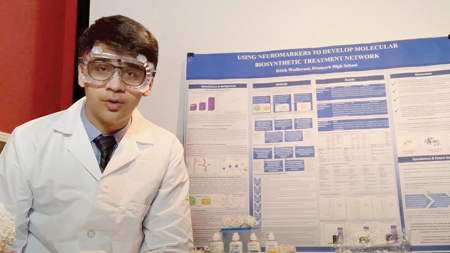 In 2018, Krish began his journey by submitting his idea for a biomedical science investigation to Discovery Education’s 3M Young Scientist Challenge. Krish became a finalist for the challenge and worked with his mentor Dr. Vasav Sahni, other 3Mers and drug delivery experts to develop an injection that would mitigate the symptoms of Huntington’s disease. The medication uses synthetic antibody mimics of antibodies that inhibit the neuromarkers associated with certain degenerative diseases. “We are aiming to create a therapy that induces immune-cell activated responses on drug targets in patients with Alzheimer’s or Huntington’s disease. We hope this can serve as a platform to revolutionize an era of synthetic and regenerative medicine,” Krish explains.