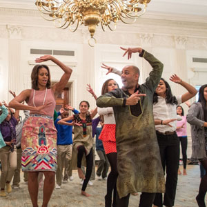 Michelle Obama tries out traditional dance moves, led by Nakul Dev Mahajan, a choreographer of the TV show So You Think You Can Dance.
