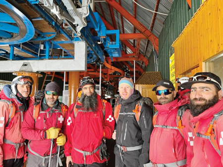 [Top] Snow safety officer Brian Newman, a Colorado native who has spent 14 winters in Gulmarg and speaks fluent Kashmiri, works alongside his native Kashmiri ski patrol to reduce avalanche risk. Newman says the area is popular because the gondola takes tourists to the Karakoram Range, from where one can see the peaks of Nanga Parbat (26,000 feet).