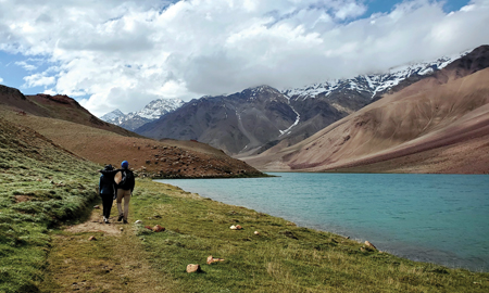 The author’s husband and daughter strolling by Chandra Taal in the upper Chandra valley of the Lahaul and Spiti districts. (Photo: Aruna Padmanabhan)