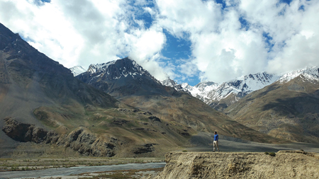 [Left] The author takes in the scenery at the confluence of rivers Spiti and Pin. (Photo:Ravi Prabhakar)