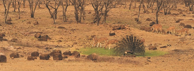 Maybe this herd will be part of hundreds of animals that die each year during the dry season, but if these deer could stay alive for the next few days, they had a chance at survival. Monsoon winds were to reach the area soon, bringing with them a promise of rain. Forest creatures prepared for the change in season. Every now and then we saw a peacock unfurl its brilliant plumage and put on an elaborate courtship display.