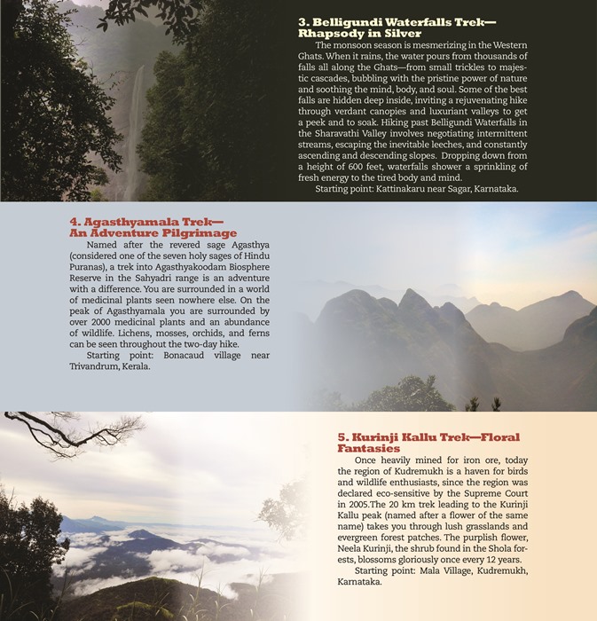 These soaring mountain ranges are known by different names across India—the Sahyadris in the West, Konkan Coast alongside the Arabian Sea, Western Ghats in Karnataka, and Nilgiris in southern India. Despite the high human habitation, the Ghats boast of extraordinary landscapes supporting varied vegetation and endemic flora and fauna. The scenery ranges from grass and rock on high ground to tea and cardamom plantations on the lower slopes to lush jungles. Treks can vary in length from a couple of days to several weeks. Here are some stimulating trekking routes along the rivers and streams of the Western Ghats. Beware of leeches!
